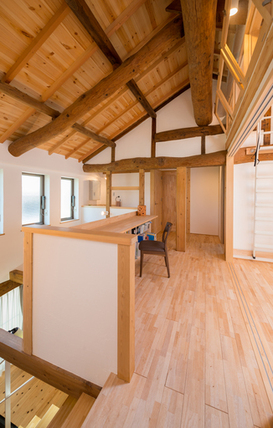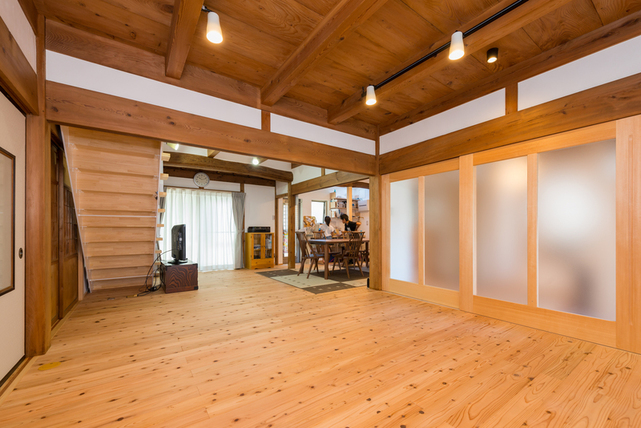 階段の位置を変えてLDKをつなぎ、2階の床を無くして吹き抜けとしました。開放的な明るい大きなと空間としました。