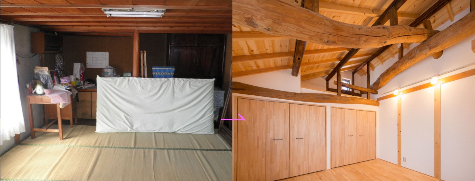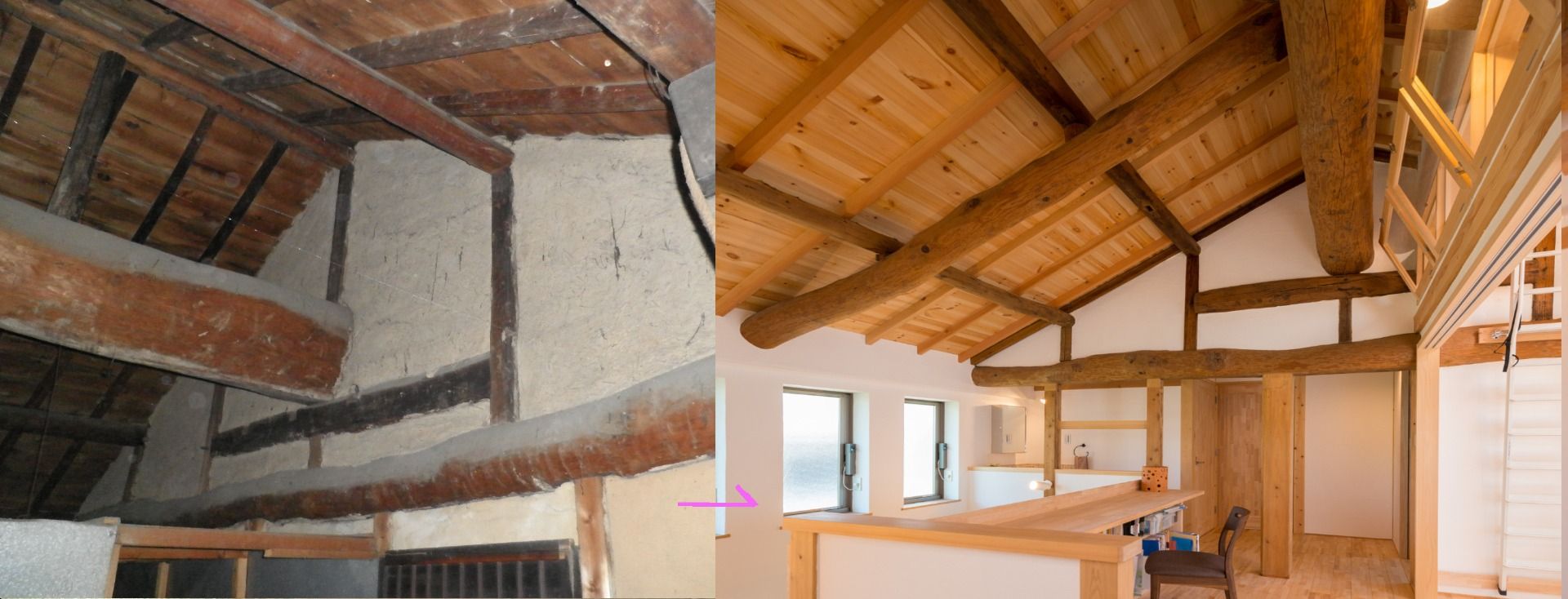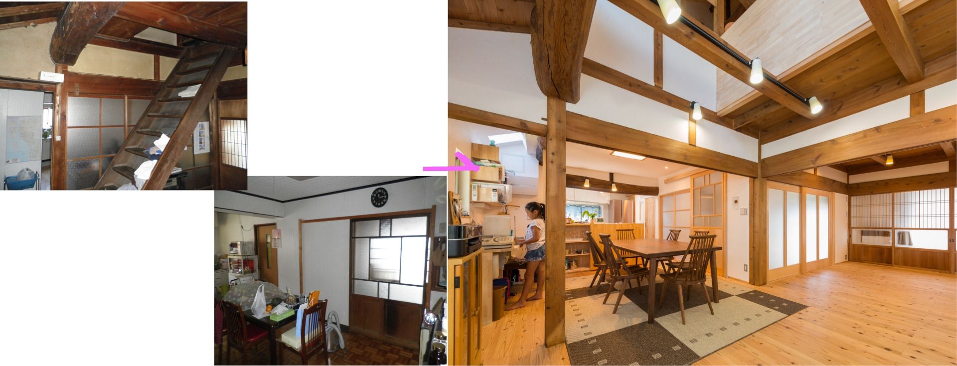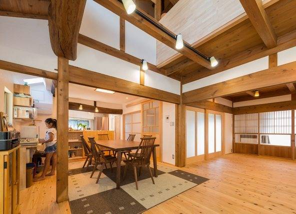 低い天井を撤去して、天井裏の梁をあらわしにして大きな空間としました。