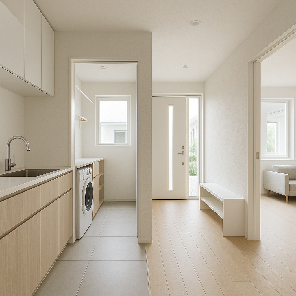 ・動線の最適化:家事動線(キッチン→洗濯→物干し)と生活動線(玄関→リビング→寝室)を分離。キッチン背面にランドリールームを設け、漆喰壁で清潔感を演出。