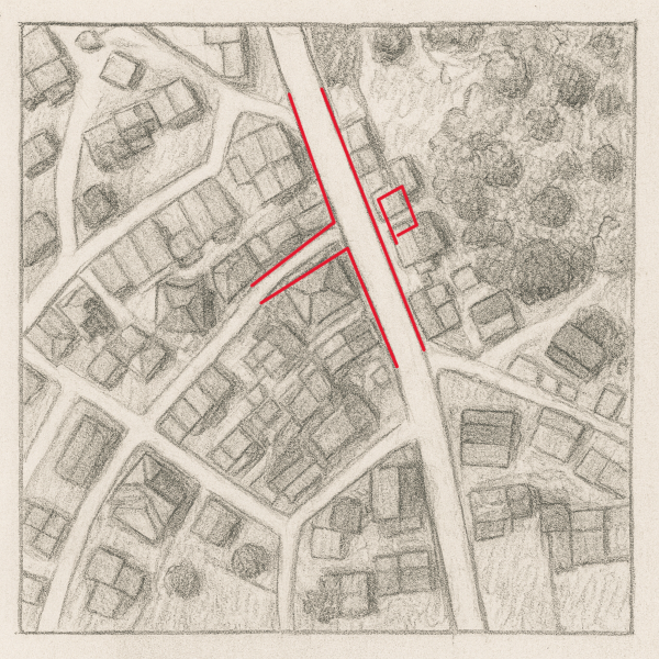 道路や川のカーブの外側に建物が位置する状態。