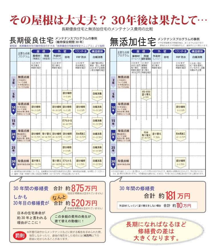 制度としては長持ちする家とされる「長期優良住宅」ですが、当社は必ずしも推奨していません。その理由のひとつが 長期的なメンテナンス費用の高さ です。