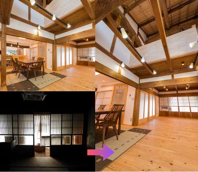この写真は古民家再生をしたお客様の自宅です。古民家でよくありがちな暗い北側にある和室を南側の和室とつないでLDKとしました。
